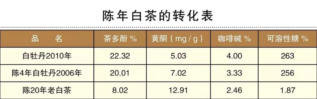 如同普洱茶“越陳越香”,白茶在陳放的過(guò)程中,其多酚類物質(zhì)不斷地陳化,轉(zhuǎn)化為更高質(zhì)量的黃酮、茶氨酸和咖啡堿等對(duì)人體有益的物質(zhì)。