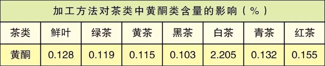 用相同原料生產(chǎn)六大茶類,其中黃酮的含量呈現(xiàn)白茶>紅茶>青茶>綠茶>黃茶>黑茶,依次遞減的變化規(guī)律。