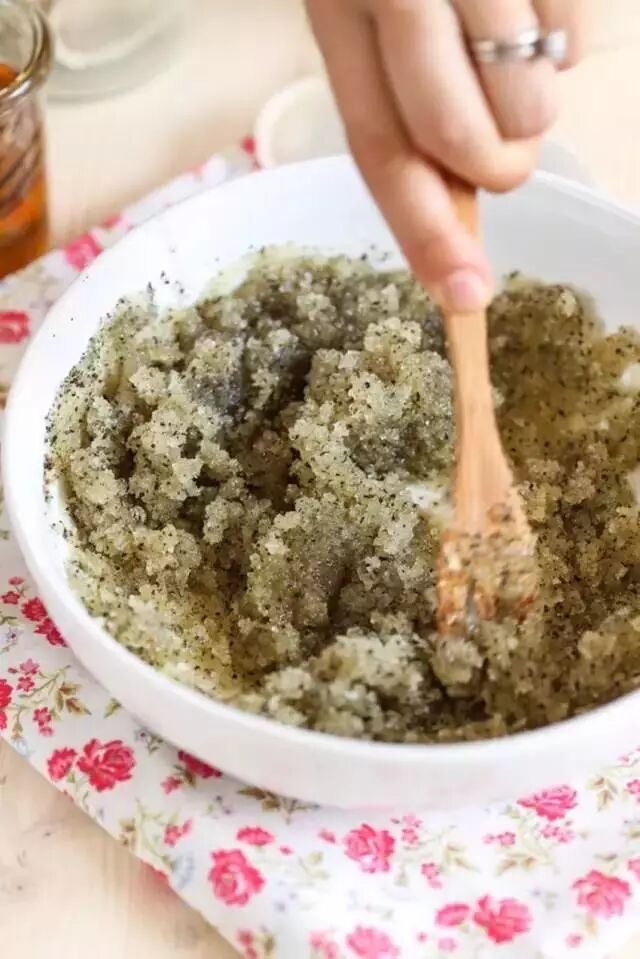 將曬干的茶葉渣磨成細粉,取1杯的白砂糖或者紅糖,1杯蜂蜜,10滴薰衣草精油(可選),把這些材料混合在一起,裝在干凈的瓶子中,就可以啦