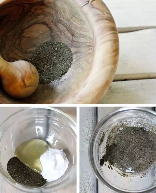 將茶葉渣曬干搗碎或者用食物處理器弄碎,取半茶匙的面粉,1茶匙蜂蜜就可以了。