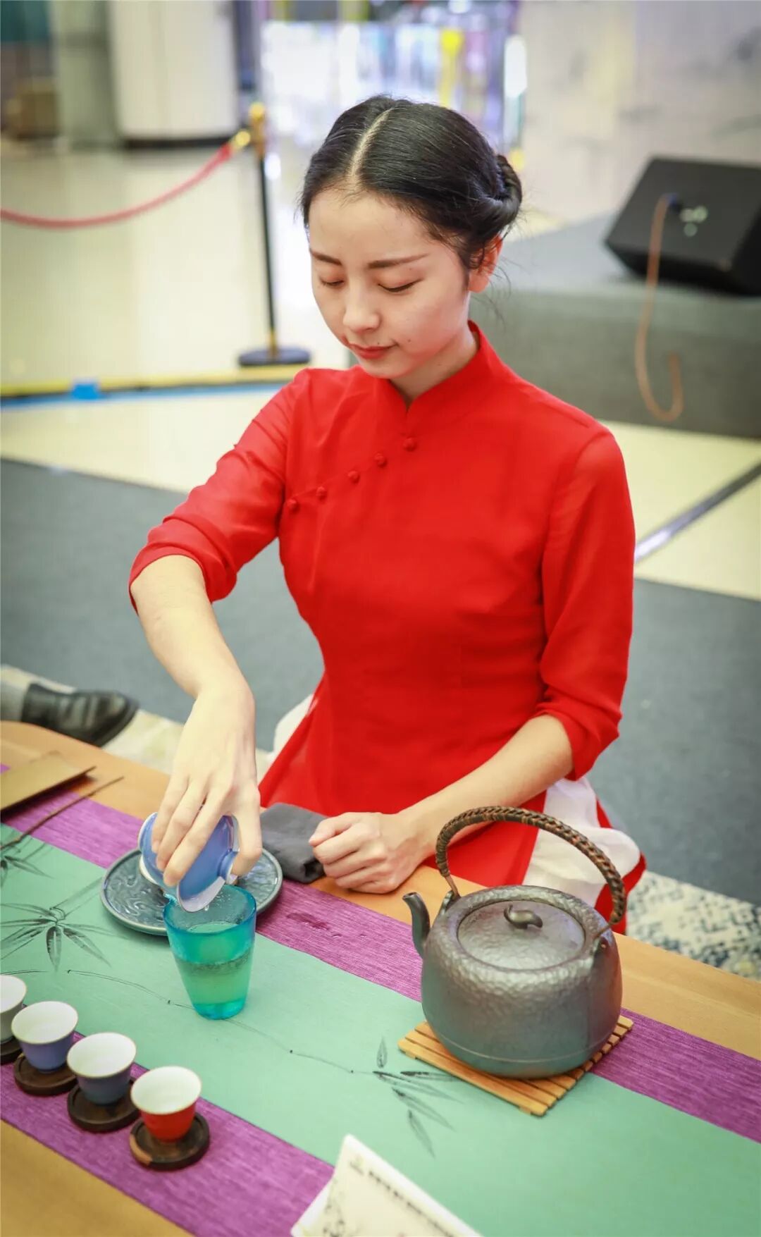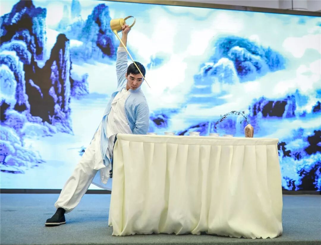 重慶花澗意茶文化總經(jīng)理陳洋帶來長嘴壺茶藝表演