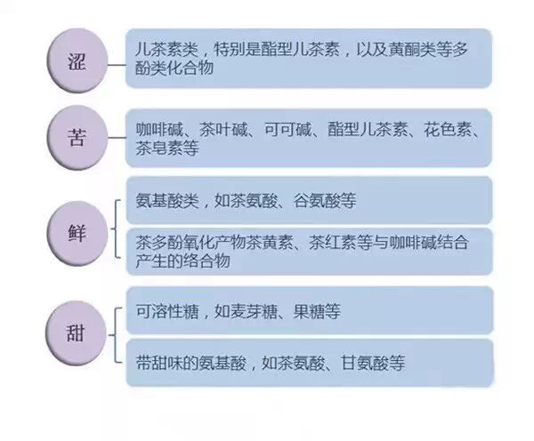 其實(shí),茶葉的滋味是一種多味的協(xié)調(diào)綜合體。茶葉呈味物質(zhì)主要是茶多酚及其氧化產(chǎn)物(茶黃素、茶紅素等)、氨基酸、咖啡堿、可溶性糖類(lèi)、有機(jī)酸、水溶性蛋白質(zhì)及芳香油等物質(zhì)。不同茶類(lèi)里這些物質(zhì)的種類(lèi)、含量及比例的不同和改變,都會(huì)深刻地影響著茶湯的滋味。茶湯的四種主要滋味及對(duì)應(yīng)的呈味成分如下圖所示: