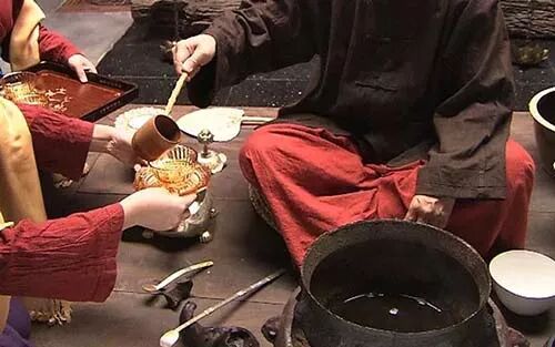 喝茶時(shí),先將餅茶碾成細(xì)細(xì)的粉末,用沸水沖點(diǎn)茶。