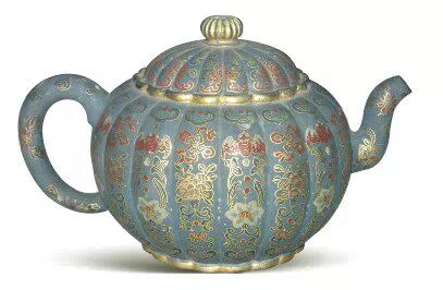 這些紫砂茶器先于宜興燒制,并經精選后,再送至宮廷造辦處由宮廷畫師依照皇帝選定畫稿加上琺瑯彩繪,二次低溫燒制而成。這也開啟了一器兩地燒制和紫砂壺琺瑯彩裝飾的先例。