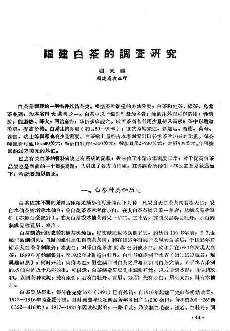 1950年,張?zhí)旄3蔀榛I備建立福建省茶葉公司(福建茶葉進(jìn)出口有限責(zé)任公司前身,以下簡稱中茶福建公司)的第一任、第一位員工。后來,張?zhí)旄1蝗蚊鼮榧夹g(shù)科科長,充分發(fā)揮了他在茶葉上的專業(yè)素養(yǎng)。上世紀(jì)六十年代,由于外銷市場需要日增,如何在技術(shù)上提高白茶品質(zhì)已成為當(dāng)時一個重要任務(wù),張?zhí)旄Q定深入探索,將白茶的資料進(jìn)行系統(tǒng)整理,開始撰寫《福建白茶的調(diào)查研究》。為此,張?zhí)旄2粌H考察了白茶貿(mào)易的歷史,還從植物學(xué)和生態(tài)學(xué)文獻(xiàn)方面對白茶進(jìn)行了考察及描述,寫成了對白茶進(jìn)行科學(xué)考察的第一份文獻(xiàn)。中茶福建公司的《白茶經(jīng)營史錄》中談到“白茶的起源”,就采用了張老文中的觀點(diǎn)。