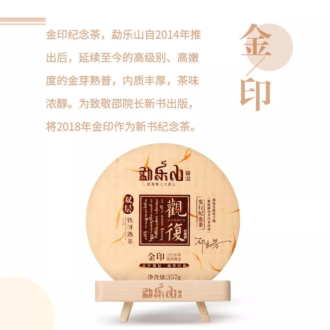 金印紀(jì)念茶,2014年推出后延續(xù)至今的高級別、高嫩度的金芽熟普,內(nèi)質(zhì)豐厚,茶味濃醇。為致敬邵院長新書出版,將2018年金印作為新書紀(jì)念茶。