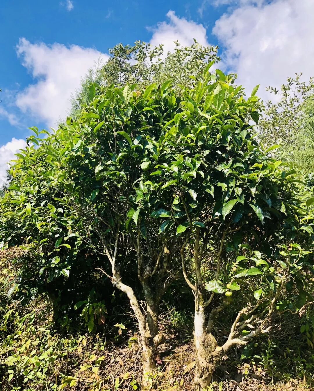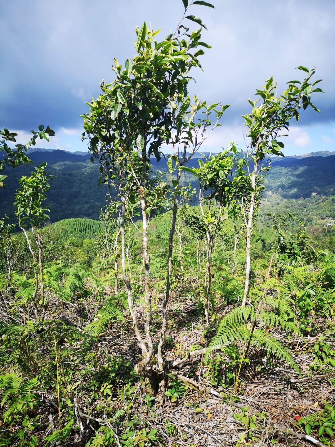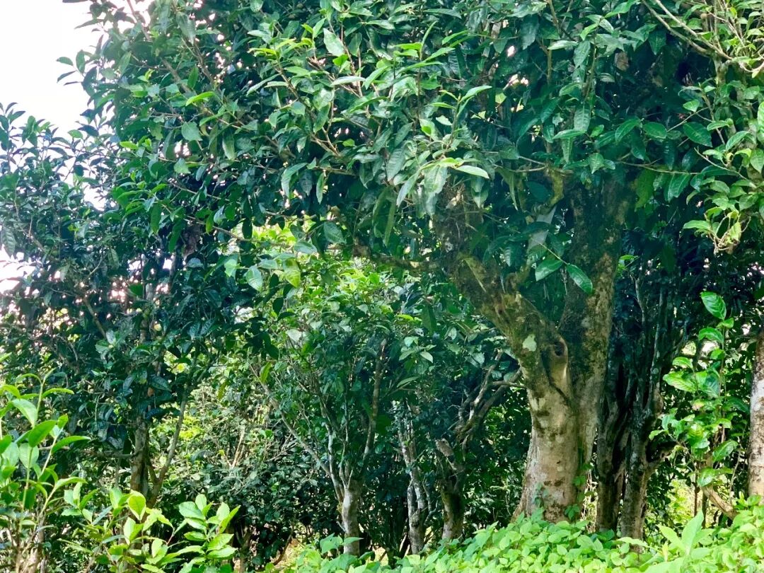 在刀宏的引領(lǐng)下,我們穿過一段緩坡,來(lái)到小嶺干古茶園,這片茶園像綿羊群依附在短坡之上,高高矮矮,錯(cuò)落于青崗的背面,一眼望去,茶林叢生,稀疏繞姿,其間蔓草野蕨雜生,整片茶林處于純放養(yǎng)狀態(tài),雖茶林野卉雜陳,但足見生態(tài)斐然,欣欣可探。