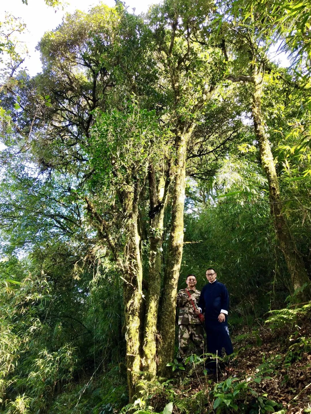 入山愈深,思想的光輝越來(lái)越盛。在茶林與原始深林交匯地帶,我們終于目睹、親近了幾百年古茶樹,眾人目擊佳樹,欣喜若狂,神思?xì)g顏,舉目撼容。而這些古茶樹及茶園四處毫不保留地展示著自然、生態(tài)的珍貴,昭示著“德宏味”普洱茶無(wú)限的光明和未來(lái)。