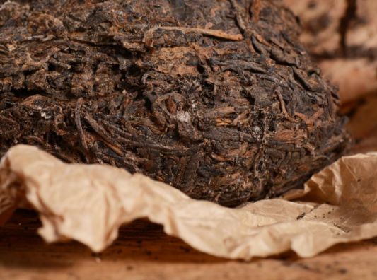 同昌圓餅,餅身厚實(shí),深褐色,條索偏長(zhǎng),白毫粗碩,是茶中極品,該普洱采用竹箬包裝成桶,竹箬上有清晰的手書(shū)墨跡“同昌號(hào)”,年代久遠(yuǎn),是目前保存較好的普洱茶。