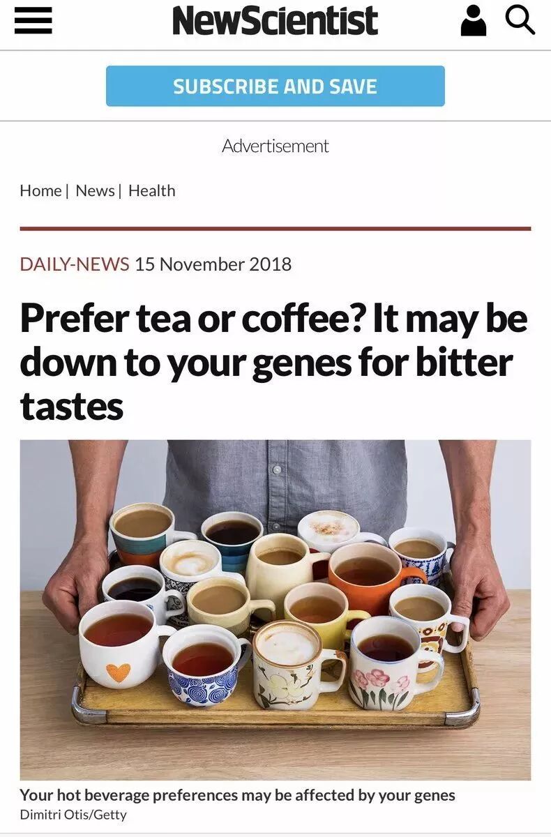 她說:“味覺基因影響我們飲用咖啡、茶或酒精的量,對茶的偏愛可以看作是放棄喝咖啡的結(jié)果,因?yàn)榛蚩赡軙箍Х茸兊眠^于刺激味覺?!?/span>