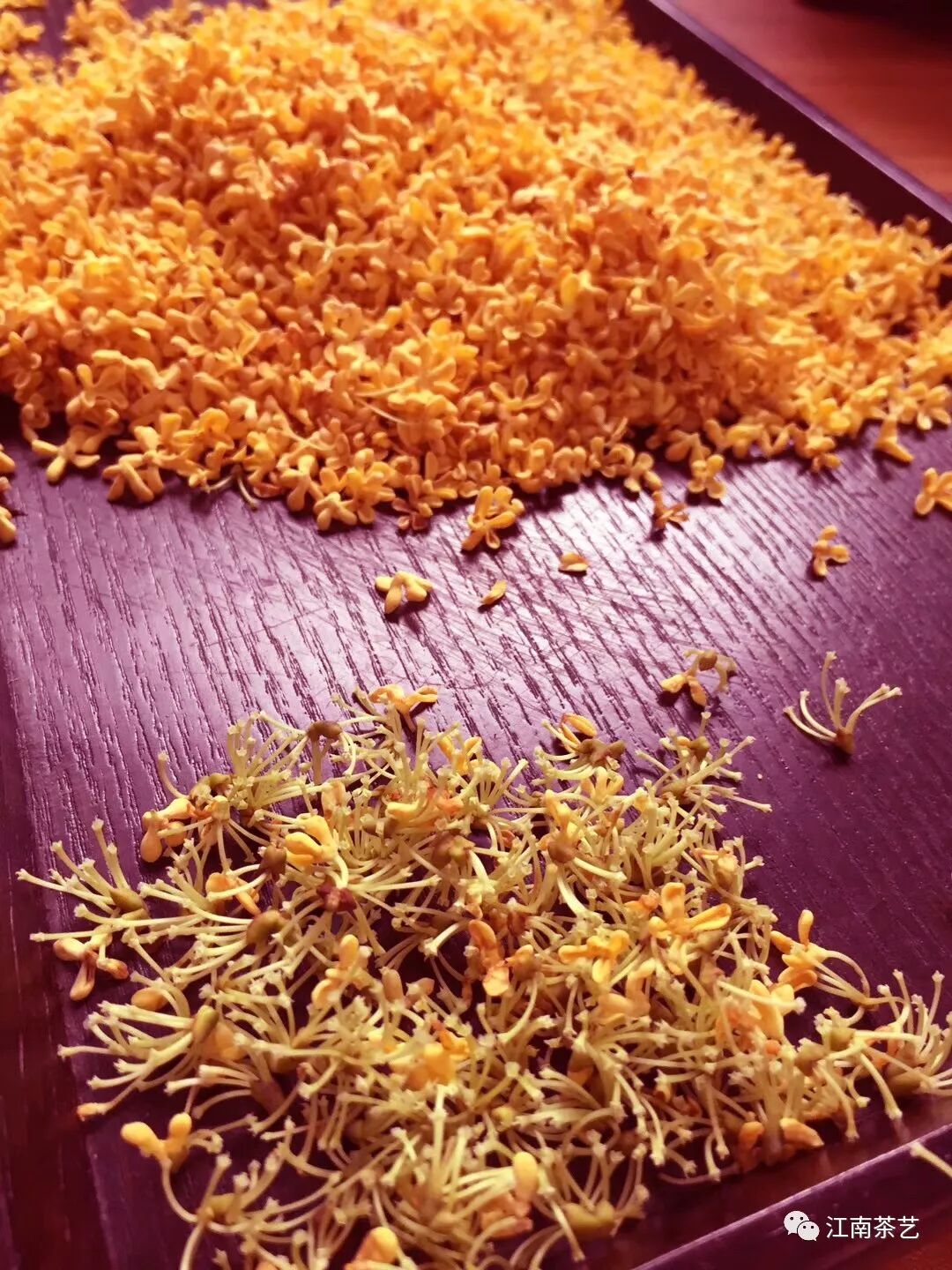 采摘回來的丹桂,粗略過篩后,細(xì)細(xì)的手工挑過,剔除敗花和桂葉等,以備窨茶;從冰箱里取出毛峰,讓它靜置升溫,或適當(dāng)復(fù)焙后再進(jìn)行窨制;