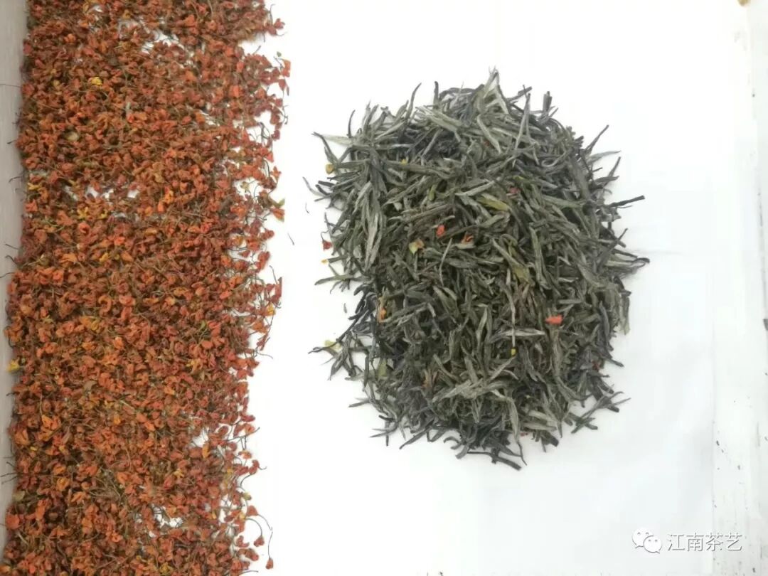 先放一層毛峰,再放一層丹桂,丹桂一鋪上去,有些就鉆到芽葉中,鮮綠的芽葉中散著零星的紅點,一吐一吸,鮮桂和茶葉進(jìn)行水分、香氣交換,花一點點的釋放香氣,再把茶葉內(nèi)含物質(zhì)一點點小分子化,給他們靜置的時間吧。