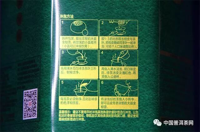 大益這個小青柑,一大罐,首先給人的感覺就是“大”氣。包裝兩邊都有防偽;罐子上印制有小青柑的沖泡方法(大益這種沖泡方法的介紹我覺得還是很好的,不說多么完美,但是至少實用),還特別的提出了溫馨提示:建議不要用平時沖泡其他熟普的紫砂壺進(jìn)行沖泡,以免柑皮的香被紫砂吸收,導(dǎo)致品飲其他類時影響其口感。建議使用蓋碗或新壺進(jìn)行沖泡。我覺得這種提示是非常重要的。