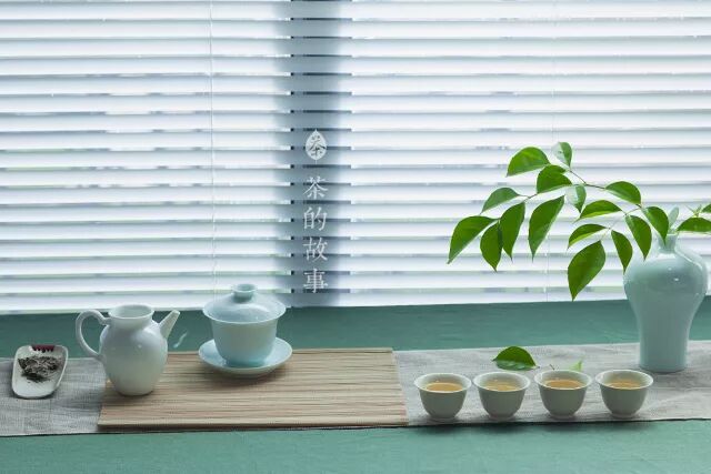 茶席上的桌布、茶具都是素雅的淡青色,搭配簡單幾片葉子,輕松營造小清新風格