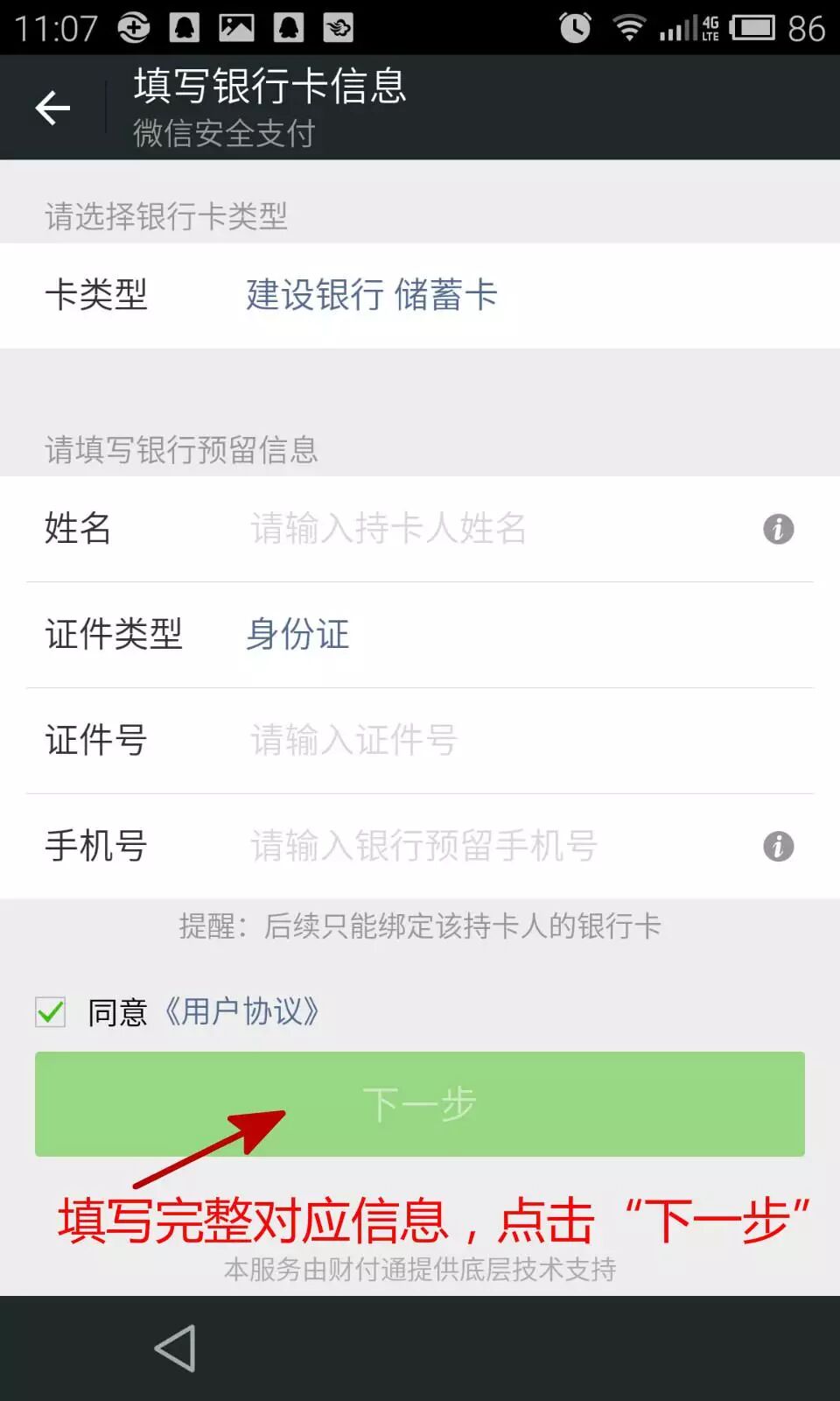 4、填寫(xiě)銀行卡信息 中 填寫(xiě)卡類(lèi)型姓名、證件號(hào)手機(jī)號(hào),再點(diǎn)擊 下一步。
