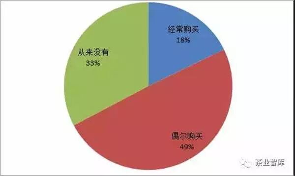 從購(gòu)買(mǎi)頻率看,調(diào)研數(shù)據(jù)顯示,18%的城市居民是經(jīng)常購(gòu)買(mǎi)的,49%的城市居民是偶爾購(gòu)買(mǎi),33%的城市居民則是從來(lái)沒(méi)有買(mǎi)過(guò)茶。
