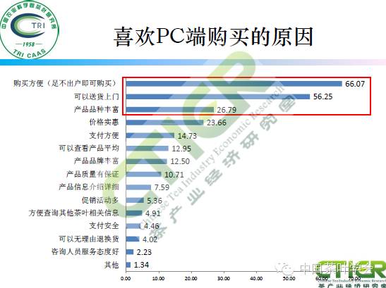 消費(fèi)者選擇實(shí)體渠道購買茶葉的主要原因是產(chǎn)品的質(zhì)量有保證,可以看到實(shí)物,并且產(chǎn)品的體驗(yàn)較好。消費(fèi)者喜歡PC端購買的原因主要是產(chǎn)品購買方便,可以送貨上門,品種豐富等。而選擇移動端購買主要是因?yàn)橹Ц斗奖?,操作簡單,?yōu)惠活動較多等原因。同時,線上的購買渠道呈現(xiàn)電商平臺集中的特性,主要集中在淘寶、天貓、京東等綜合性大型電商平臺。