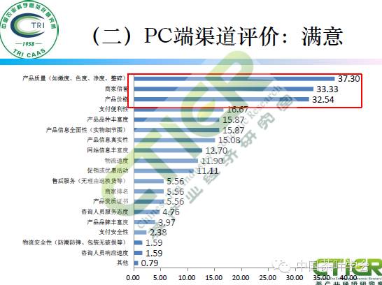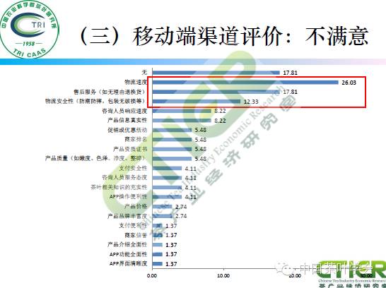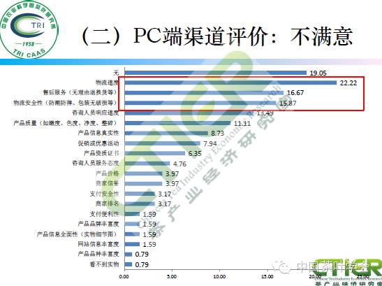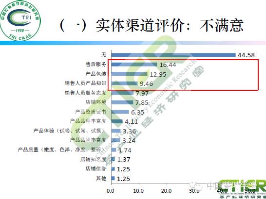 目前線下渠道滿意度高于線上渠道,線下渠道的詬病點(diǎn)集中在產(chǎn)品包裝、售后服務(wù)、銷售人員知識不足等方面,而線上渠道主要的不滿意點(diǎn)為物流速度、售后服務(wù)、物流安全性等問題。