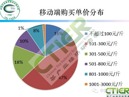 消費(fèi)者在實(shí)體渠道購買的茶葉價格以100-300元/斤為主,占到48%,300-500元/斤的占到22%,不超過100元/斤的占19%。在PC端購買的單價分布為,100-300元/斤的占39%,300-500元/斤的占33%,不超過100元/斤的占11%。移動端47%的消費(fèi)者購買了100-300元/斤的茶葉,18%的人購買300-500元/斤的茶葉,16%選擇了100元/斤以下的產(chǎn)品。