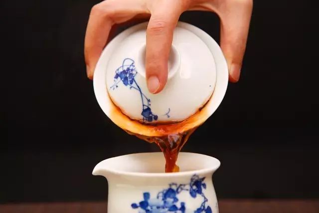 蓋碗有一個(gè)蓋鈕,既是開(kāi)蓋時(shí)捏住的地方,也蓋住時(shí)需要按住的地方。出湯的時(shí)候,蓋子調(diào)整好合適的開(kāi)口大小,食指放在蓋鈕上,拇指和中指抓住碗沿的兩側(cè),無(wú)名指和小指彎曲并在中指邊上,不與蓋碗接觸,把蓋碗垂直過(guò)來(lái),即可出湯。注意無(wú)名指和小指不可像蘭花指那樣翹起,這個(gè)動(dòng)作會(huì)顯妖嬈,是茶藝中的大忌。
