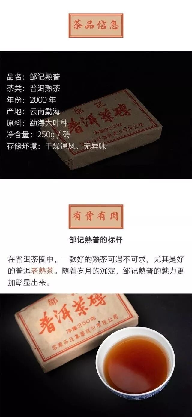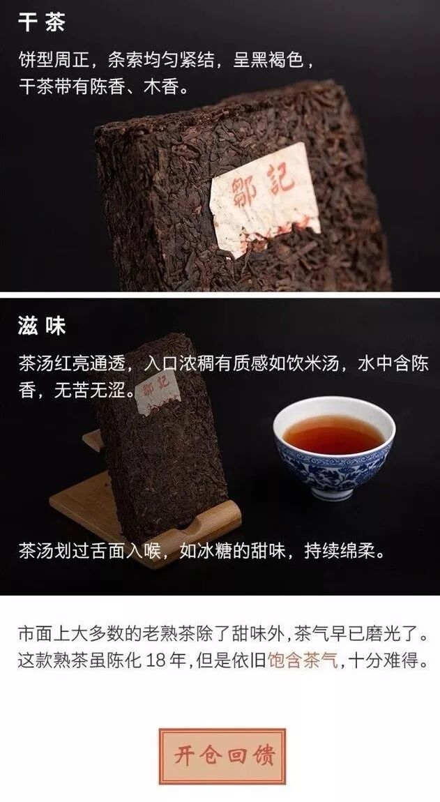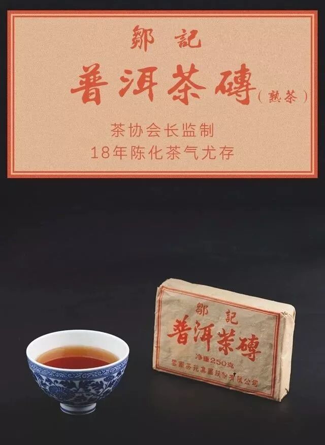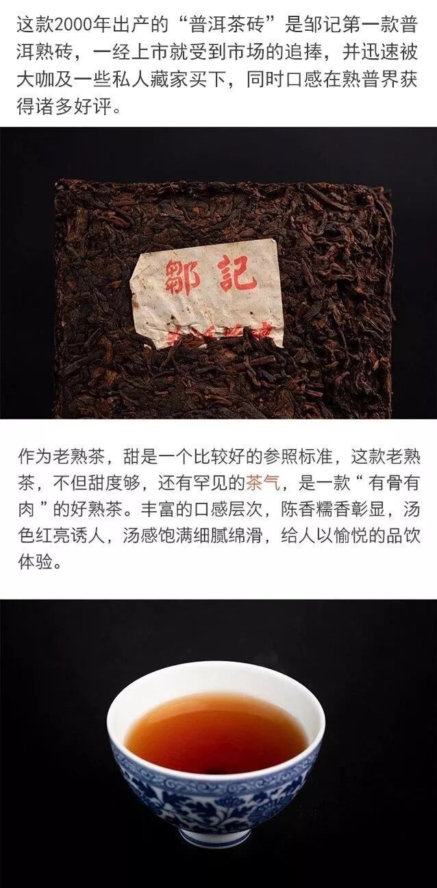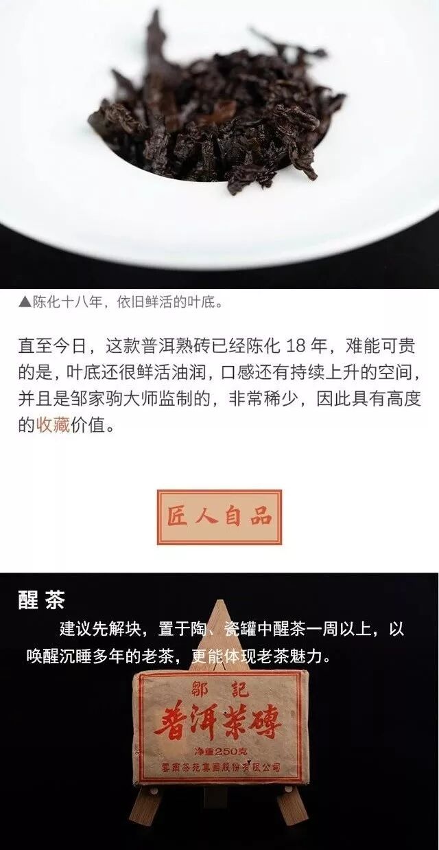 這款熟磚為第一款鄒記熟普,并由云南茶葉協(xié)會會長鄒家駒先生親自監(jiān)制,口感有骨有肉,雖18年陳化,但茶氣未減,風(fēng)韻猶存。
