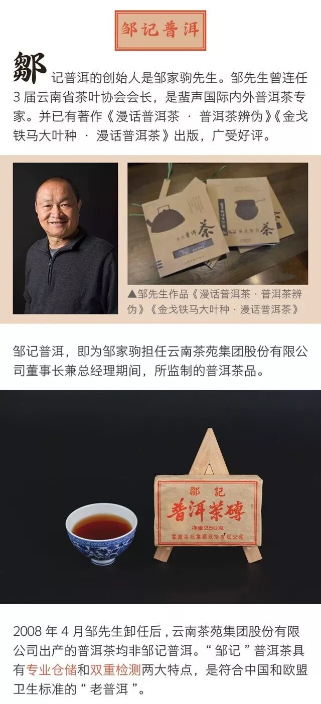 2000年的“普洱茶磚”,是鄒記的第一款熟茶,少量上市,就受到很多藏家的喜愛和追捧,再加上鄒家駒個人在茶界的聲譽,這款普洱熟磚在市場上可謂是供不應(yīng)求。